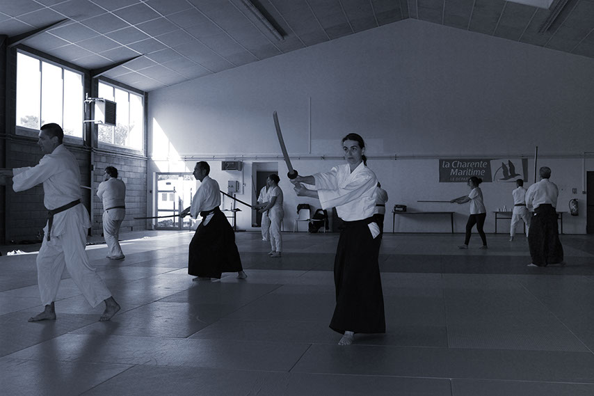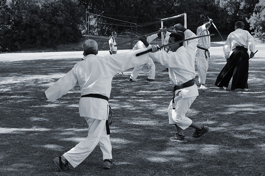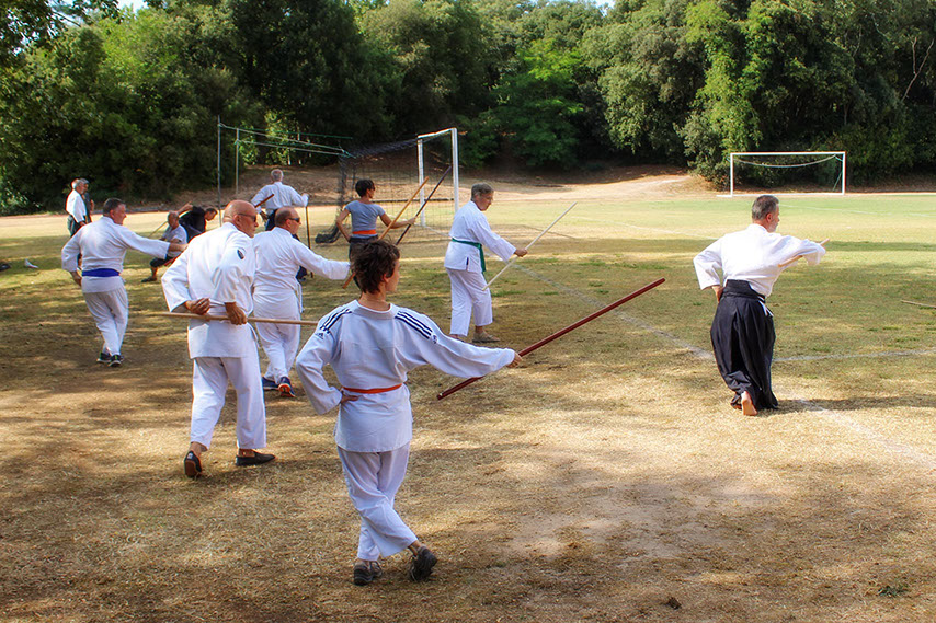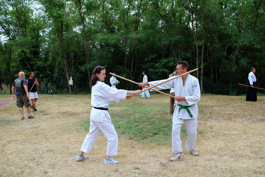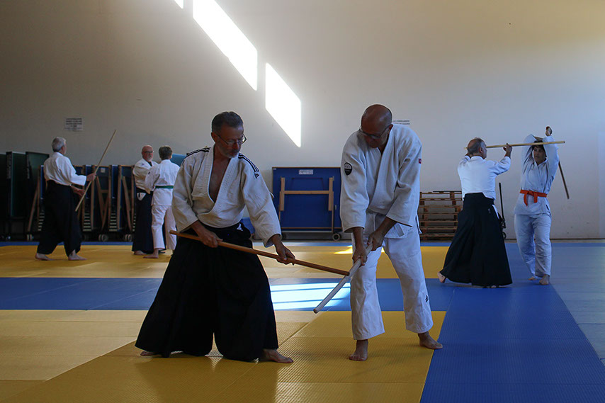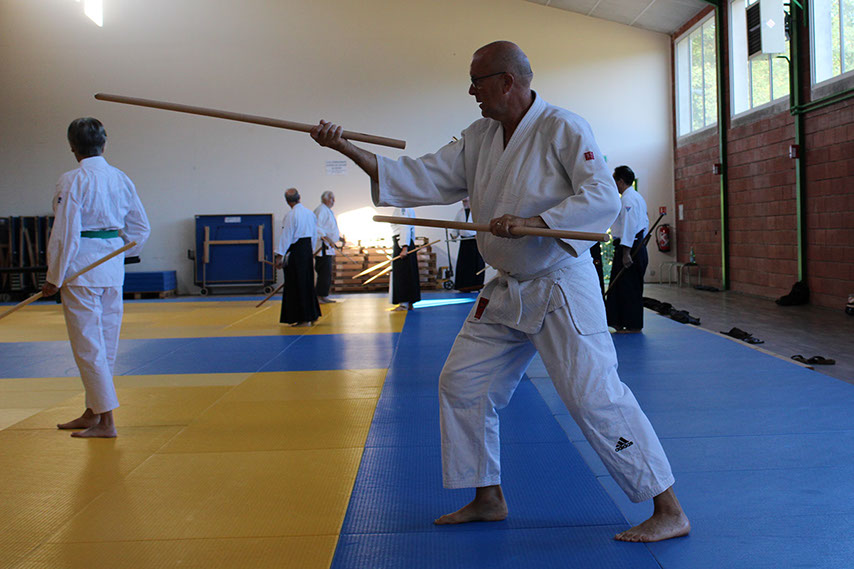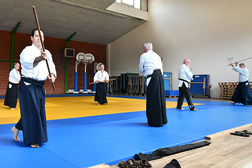 Nous n'avons su que très tard que le stage d'été serait maintenu. Finalement, le centre sportif de Boyardville a ouvert ses portes avec les consignes sanitaires d'usage et une restriction de chambres allouées. Nous étions donc moins nombreux que les autres années et pour respecter la distanciation physique et sociale, nous avons dû travailler en deux groupes, l'un dans le dojo et l'autre en extérieur en alternance. Enfin, pour éviter tout contact, nous avons pratiqué exclusivement les armes (jo, boken et katana), ce qui n'a pas empêché la diversité puisque puisque Maître Brun nous a légué une pratique aux armes particulièrement développée et riche, cela dès les premiers kyu.