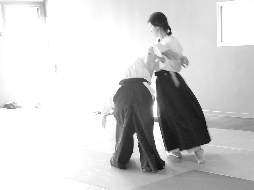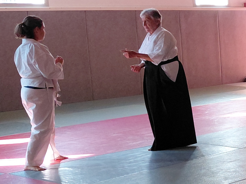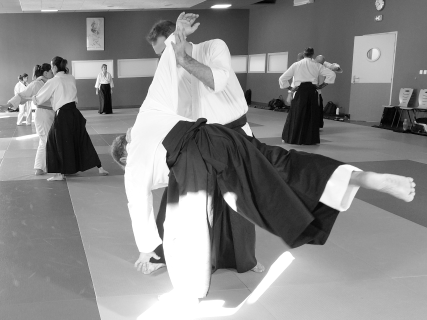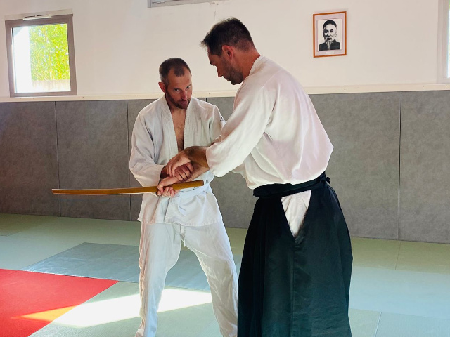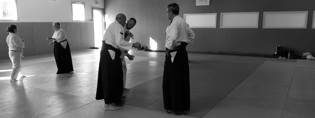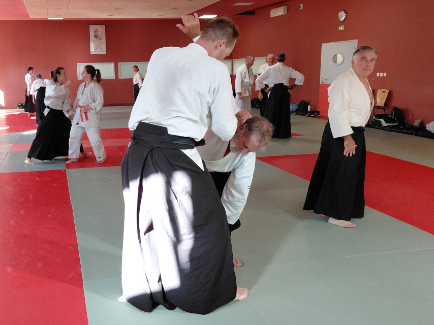 L’Aïkido Club Pradétan nous accueille pour ce stage de ligue. Pour amorcer la séance après l’échauffement, Kokyu sur Ryote Katate Tori ou Morote Dori afin de prendre conscience des postures par rapport au partenaire dans la position et les déplacements des pieds pour entrer dans la pratique et appréhender les Ukemi. Ensuite, l’attaque choisie est Uramen Uchi avec une entrée en Aï Hanmi pour se positionner en centre et sur l’axe de la sphère commune. Pour débuter, Irimi Nage Ura et Omote afin de se familiariser avec l’esquive en entrant sur l’axe. Puis, une entrée directe est proposée avec la notion du bokken la pointe vers l’avant avec la main ciel – terre en avançant de deux manières, soit en Tsugi Ashi ou Ayumi Ashi avec toujours le centre dirigé vers Uke. Sur toujours cette même attaque et l’entrée en Aï Hanmi un travail en Jyu Waza est demandé afin de ne pas rester bloqué et exécuter le geste approprié dans cet instant. Pour conclure, un exercice au bokken en analogie au premier mouvement du Kata Jo est présenté pour un lâcher-prise et un retour au calme. Une fois encore une jolie ambiance studieuse qui a contribuée au plaisir et à la joie de pratiquer.