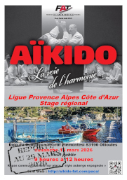 Traditionnellement le stage régional du mois de mars est organisé par ASCL-Techmer Aïkido. Il se déroulera à Ollioules au Complexe Sportif Piemontesi, mais attention, en raison des éléctions municipales, il est reporté au dimanche 29 mars 2026 avec un cours s'adressant à tout public le matin de 9 heures à midi et pour ceux qui le souhaitent la possibilité d'un repas "style auberge espagnole".